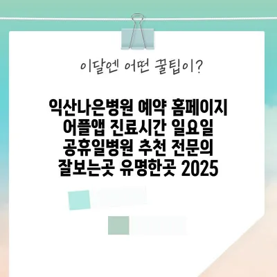 익산나은병원 예약 홈페이지 어플앱은 환자들이 편리하게 진료 예약을 할 수 있도록 도와줍니다. 이 병원은 진료시간이 유연하여, 특히 일요일이나 공휴일에도 진료를 …