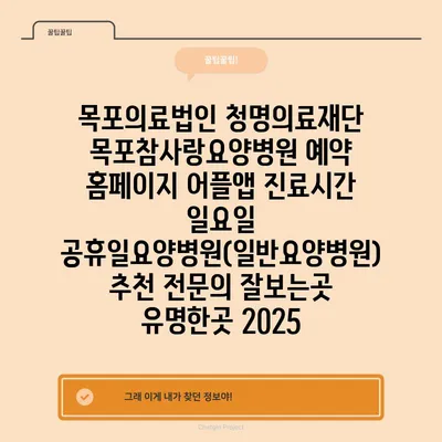 목포의료법인 청명의료재단 목포참사랑요양병원은 환자 중심의 요양 서비스를 알려알려드리겠습니다. 특히, 예약 홈페이지와 어플 앱을 통해 손쉽게 진료 예약을 할 수 있어 …